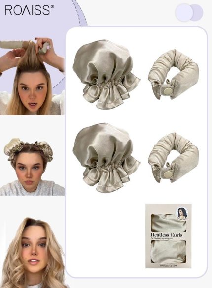 رويس مجموعة مكونة من 4 قطع من مجعد الشعر الخالي من الحرارة من الساتان، بكرات شعر لتجعيد الشعر بدون حرارة مع أغطية للشعر، وحزام رأس ناعم لتجعيد الشعر الطويل، ومجموعة للنوم طوال الليل (بيج)