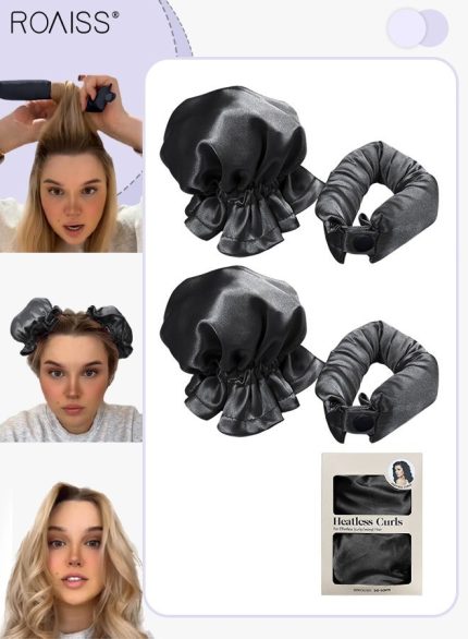 رويس مجموعة مكونة من 4 قطع من مجعد الشعر الخالي من الحرارة من الساتان، بكرات شعر لتجعيد الشعر بدون حرارة مع أغطية للشعر، وحزام رأس ناعم لتجعيد الشعر الطويل، ومجموعة للنوم طوال الليل (أسود)