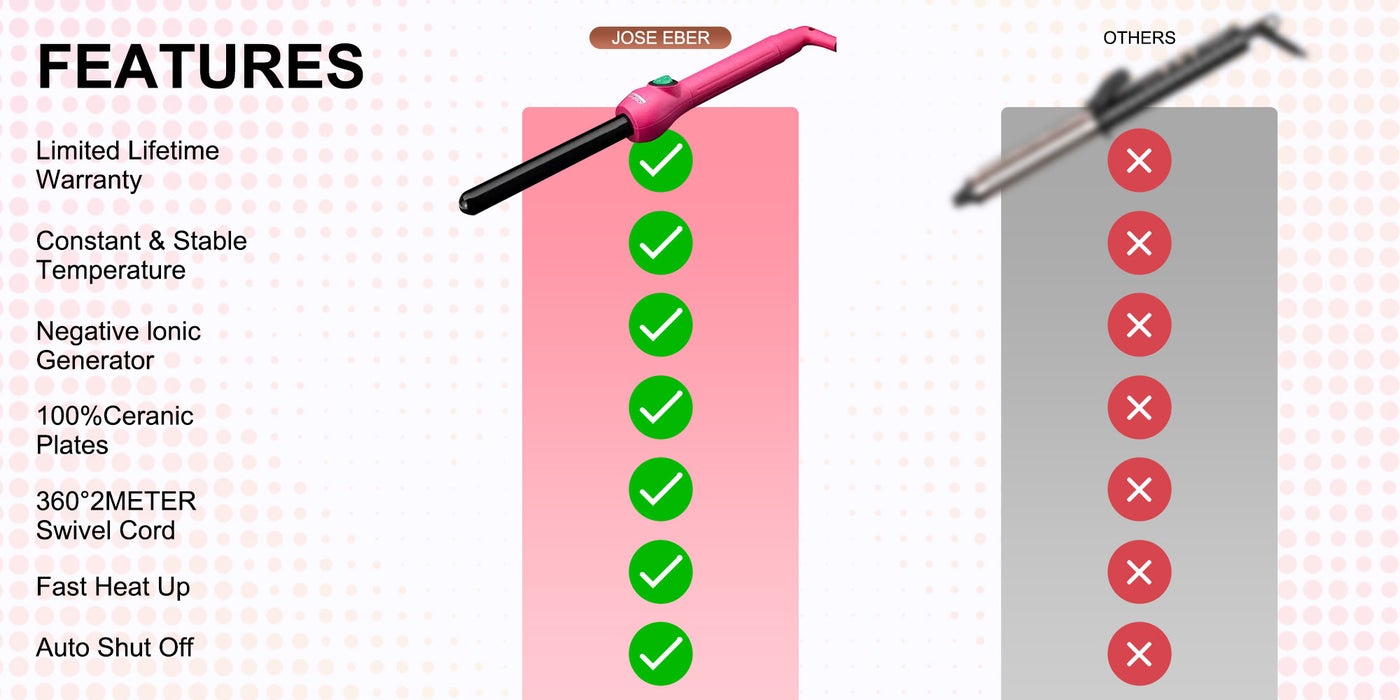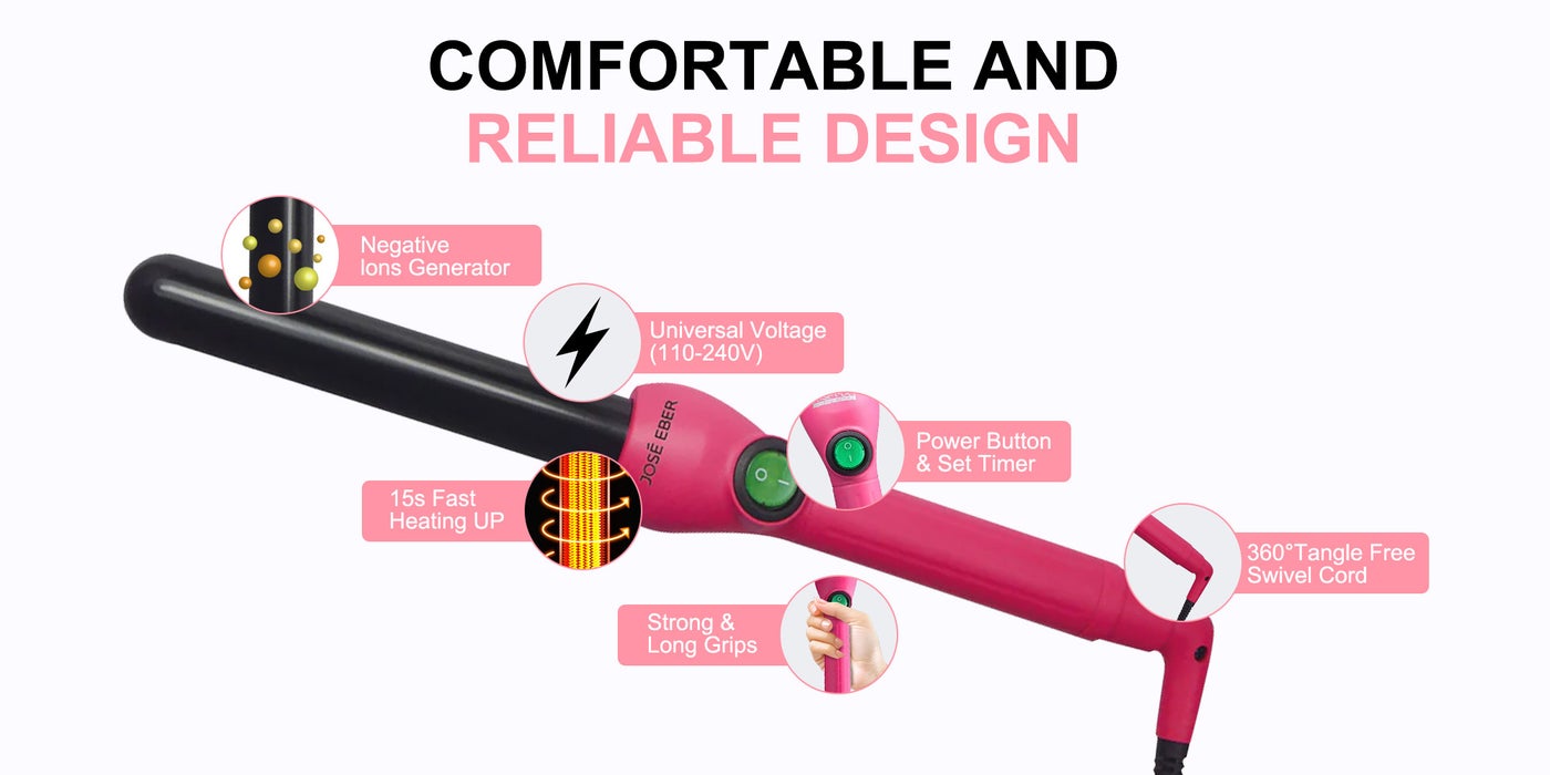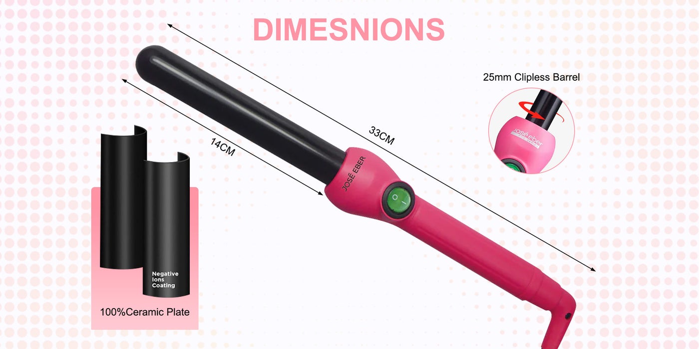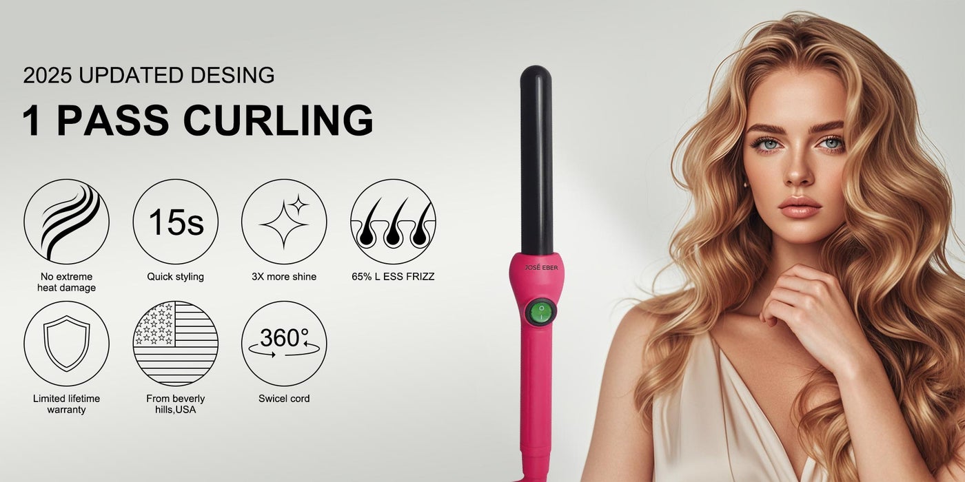- تعليمات: تأكدي من أن الشعر جاف تماماً قبل التجعيد، وارتدي قفازاً مقاوماً للحرارة في اليد التي تمسكين بها الشعر