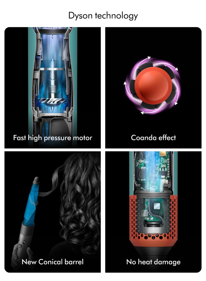 The new Dyson Airwrap i.d.™ allows you to wrap, style, and set your curls at the touch of a button. Range of new attachments to dry, curl, shape, smooth and hide flyaways with no heat damage for straight to wavy hair types. Vinca blue Presentation case and six attachments included. Meet the new attachments More styles. No heat damage. Conical barrel Its conical shape makes this barrel easy to use. Get close to the roots for defined curls throughout your hair, and volumised, bouncy styles. Wave+Curl diffuser One attachment, two modes for waves, curls and coils. Dome mode creates a cushion of air to enhance natural shape for a more defined finish. Diffuse mode adds volume and texture. Dyson technology Style with Coanda airflow, not extreme heat Fast, high pressure motor Spins at 110,000rpm, generating enough pressure to create the Coanda effect. Coanda effect Dyson harnessed the Coanda effect to wrap and hold hair around the styling barrel. Creating curls with air, not extreme heat. New Conical barrel The new Conical barrel is engineered for Coanda airflow along its tapered shape. Easier styling, right to the root. No heat damage Dyson's intelligent heat control keeps temperatures under 150C, preventing extreme heat damage and protecting shine.