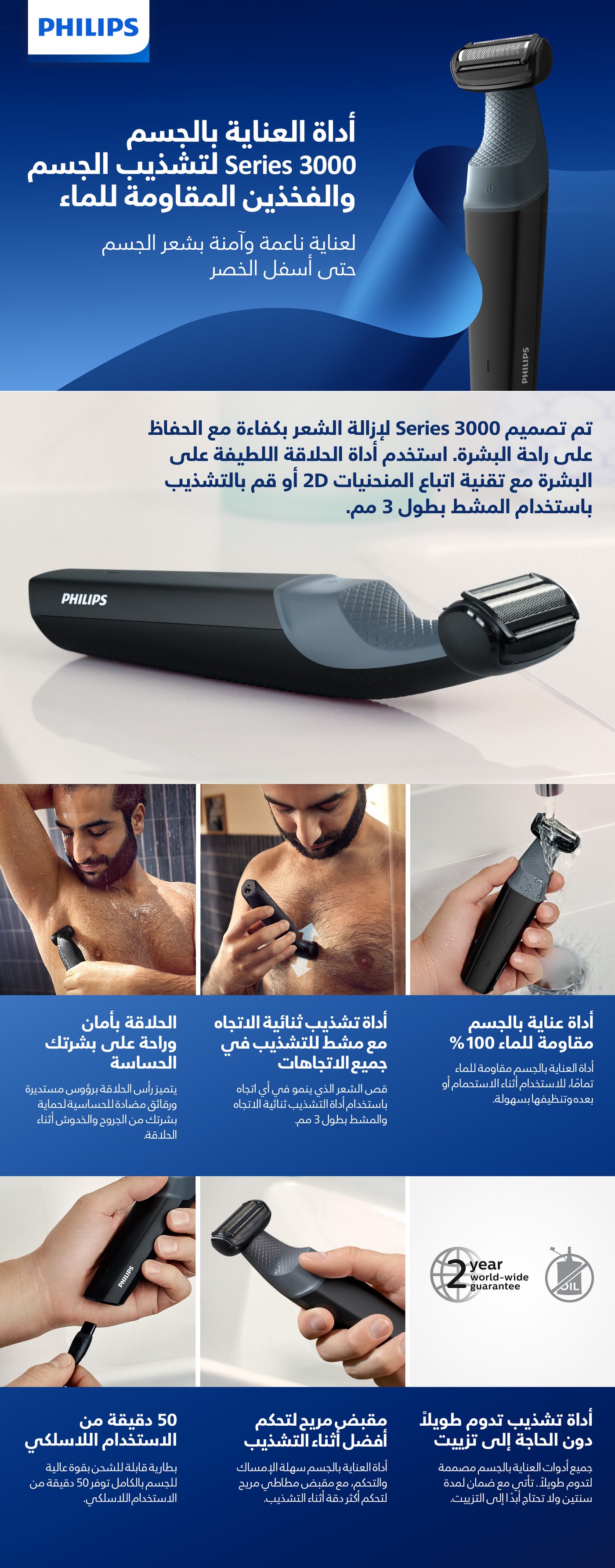 فيليبس ماكينة تشذيب شعر الجسم BG3027/03 من Philips | أداة تشذيب الجسم والفخذين المقاومة للماء | أداة لحلاقة شعر الجسم، مشط قابل للتعديل بـ 3 إعدادات للطول | 60 دقيقة من الاستخدام اللاسلكي، حماية للبشرة، مقبض مريح