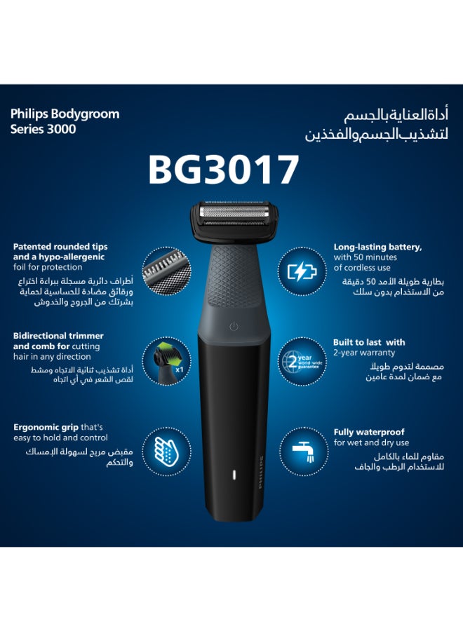 فيليبس ماكينة تشذيب شعر الجسم BG3017/01 من Philips | أداة تشذيب الجسم والفخذين المقاومة للماء | شفرات مضادة للحساسية، حلاقة مريحة ودقيقة، مشط 3 مم | 50 دقيقة من الاستخدام اللاسلكي، مقبض مريح