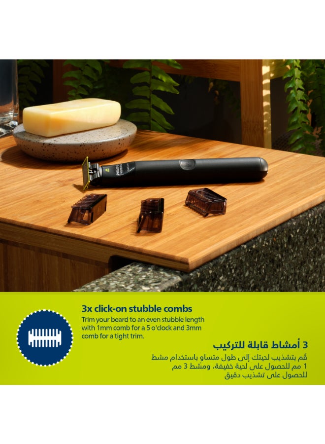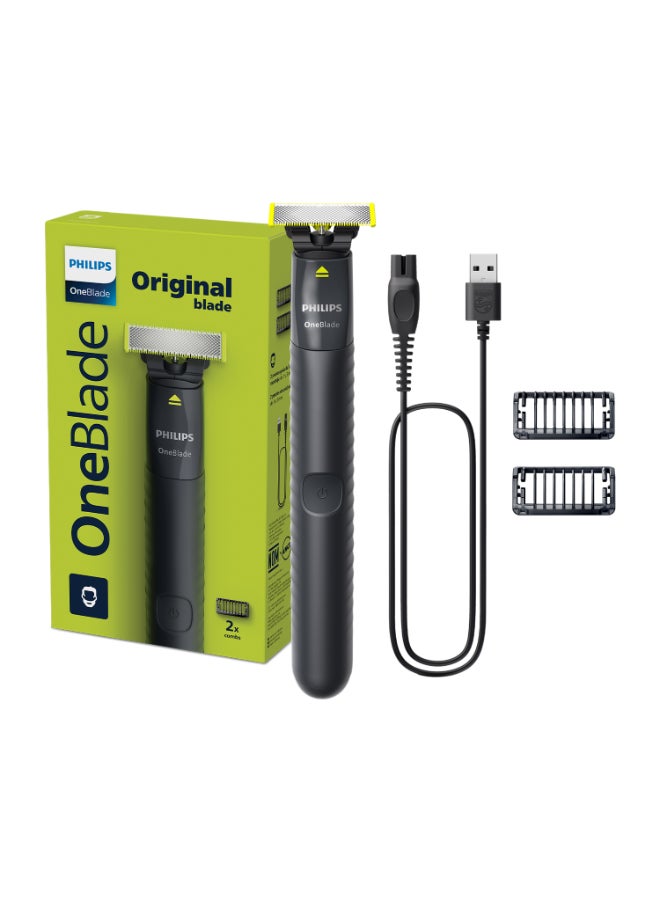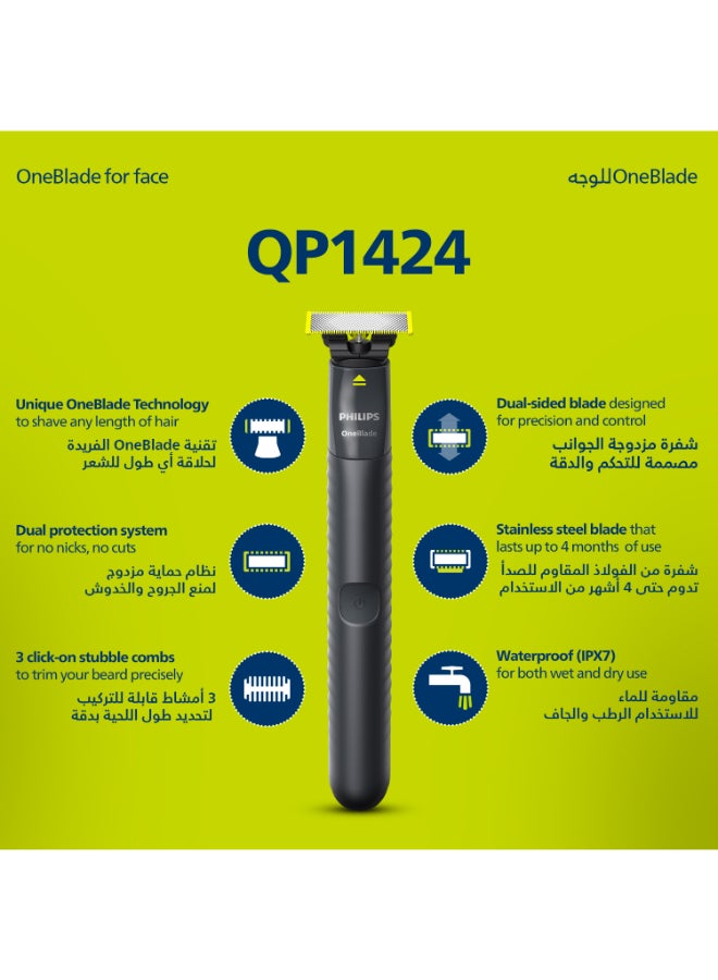 فيليبس ماكينة OneBlade QP1424/10 من Philips | تشذيب، تحديد، وحلاقة أي طول للشعر | 2 أمشاط لشعر الذقن الخفيف، شفرة مزدوجة الجوانب | للاستخدام الرطب والجاف، 30 دقيقة من الاستخدام اللاسلكي 0.15جرام