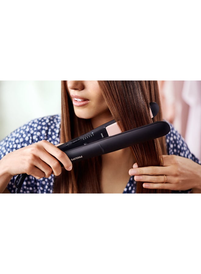 Specially designed for easy and fast styling with long Keratin-infused plates and 6 LED temperature settings. Care for your hair with ThermoProtect technology preventing overheating and to give your hair vibrant shine with ions.