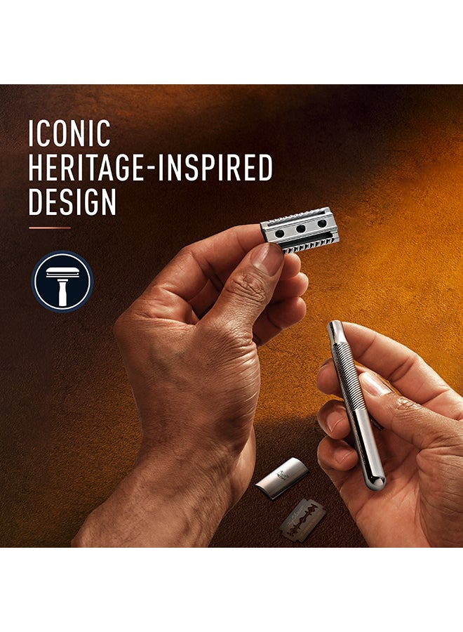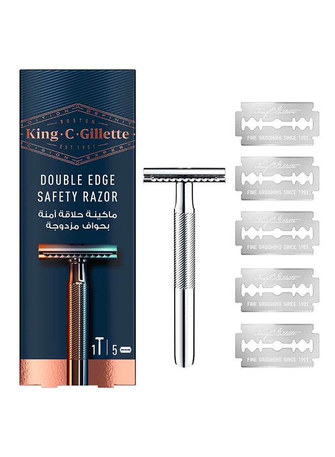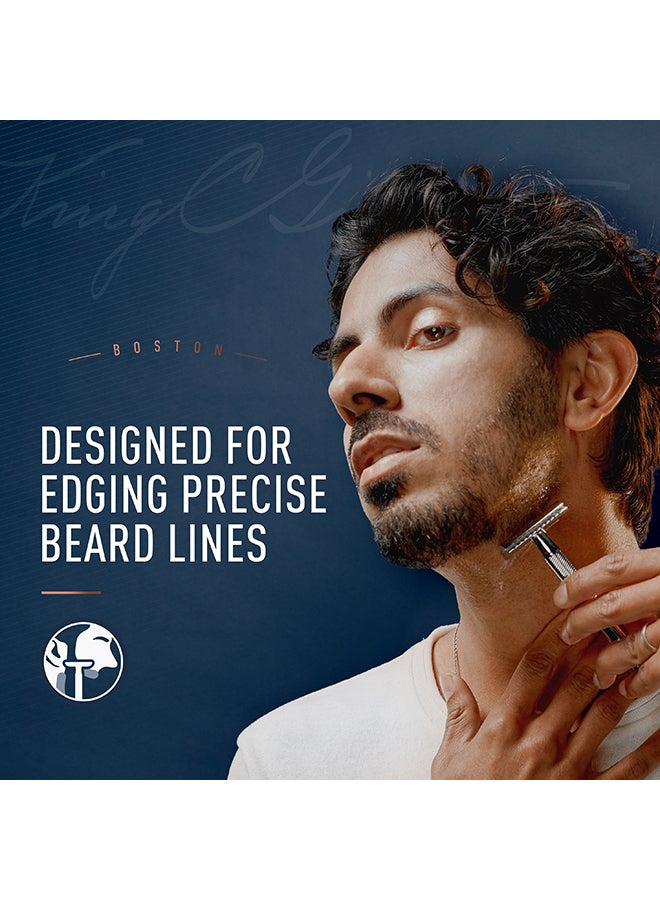 ماكينة حلاقة آمنة بحافة مزدوجة من King C مصممة للحواف مع مشط مغلق ولمسة نهائية مطلية بالكروم مع 5 شفرات مطلية بالبلاتين