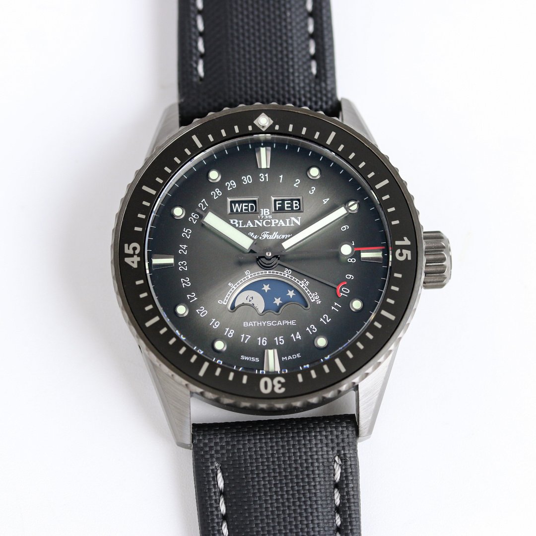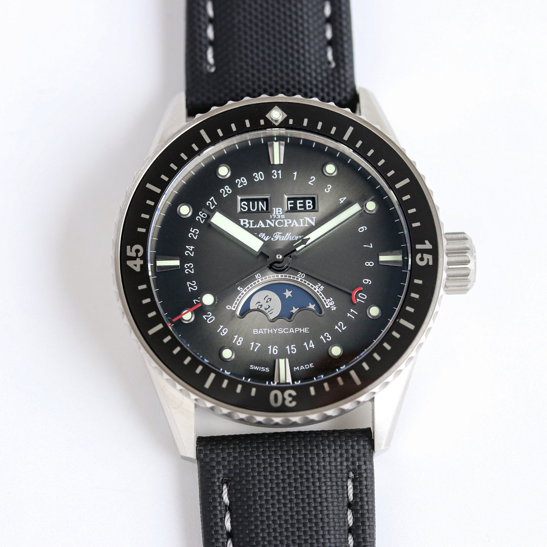 The ceramic material boasts a brilliant luster, high hardness, non-fading color, stain resistance, and excellent wear resistance. [Case] ​​The bezel is perfectly matched, with a strong three-dimensional feel! It will never fade and feels smooth and comfortable against the skin. The crown is precisely engraved with superb craftsmanship! [Clasp] The satin ceramic clasp is meticulously polished both inside and out, and the clasp pin tip features multi-faceted beveling, perfectly replicating the details of the original! [Movement] Utilizing a precise Hangzhou 7-series movement modified to resemble the Blancpain 6654.P.4 movement, it features multiple functions displayed on the dial (the window at 12 o’clock displays the day and month, and the sub-dial at 6 o’clock displays the moon phase, complete with Blancpain’s iconic elegant moon face). The bridge jewel bearings match the color of the original, ensuring a truly authentic look and preventing the bridge from looking fake! The integrated bridge design, in addition to being closer in appearance to the original, also provides better protection for the movement, resulting in greater stability! The bridge is ground and then beveled, a meticulous process to prevent copper shavings from falling into the movement and causing it to stop. [Dial] The date display size and color are perfectly matched, and it uses 100% Swiss imported C3 luminous material, with brightness and longevity comparable to the original! [Water Resistance] 100% three-stage waterproof tested at the factory.