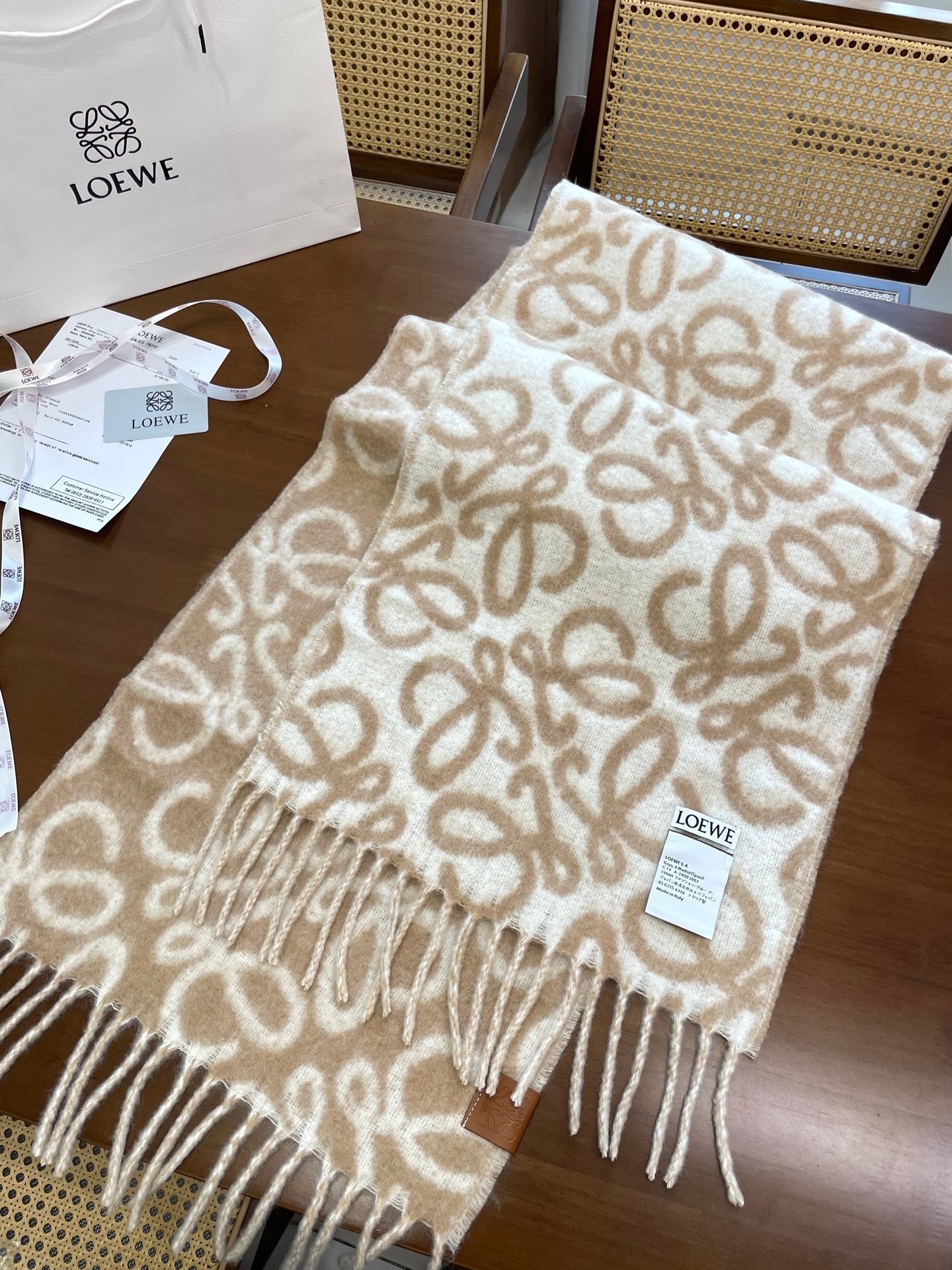 Scarf in double face alpaca and wool blend jacquard featuring an allover Anagram pattern. 37cm x 185cm Fringed edges Anagram embossed leather tab placed at the side cm·in ColourBeige/White Main materialAlpaca/wool Weight0.31 kg Height200…