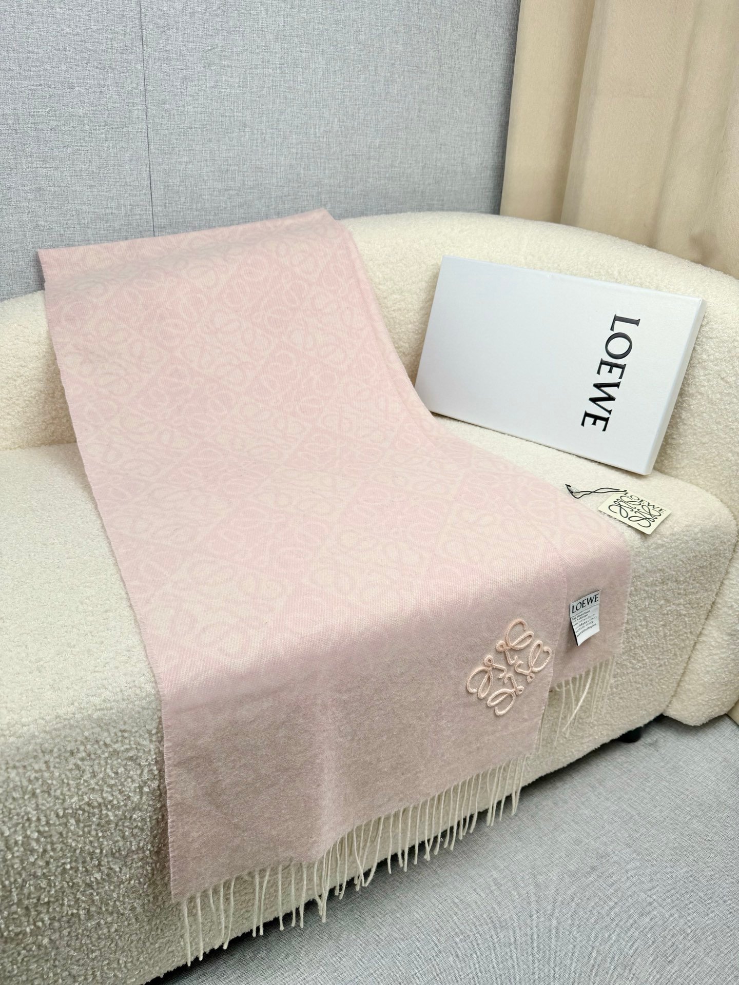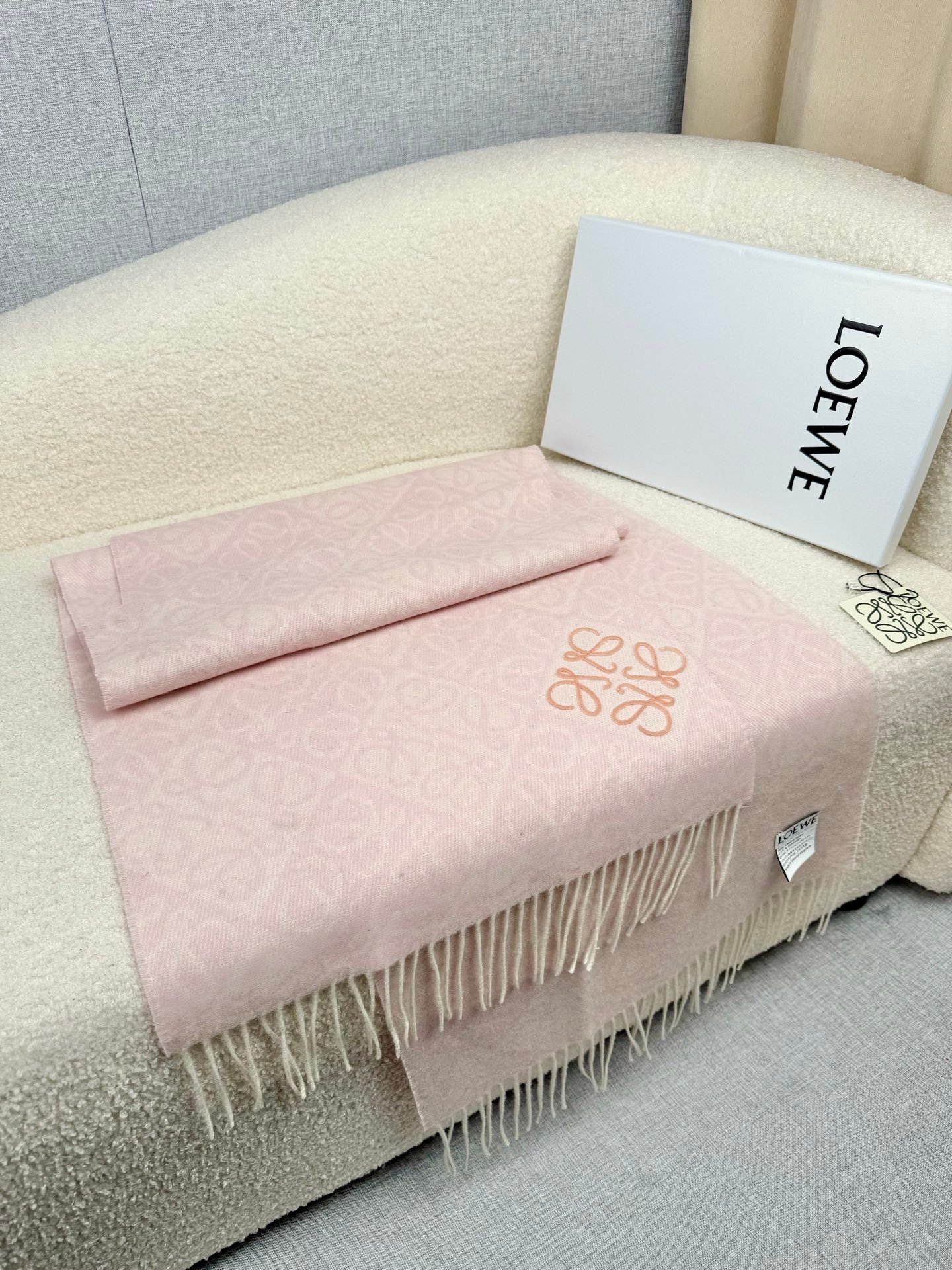 Scarf in double face wool and cashmere jacquard featuring a two-tone Anagram pattern. Fringed edges Anagram tufting embroidery placed at the corner cm·in ColourGrey Main materialWool/cashmere Weight0.15 kg Height180 cm Width38 cm