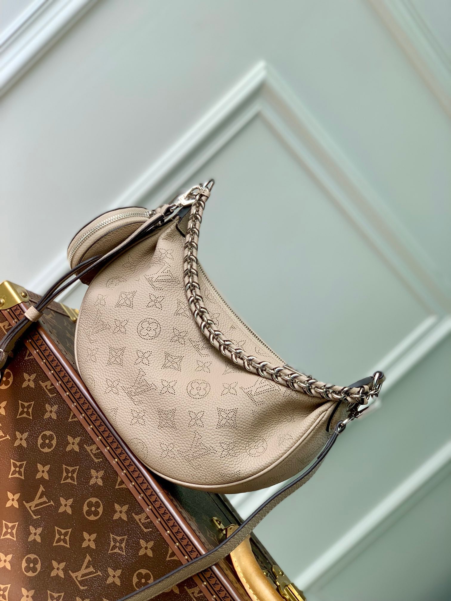 A new addition to the Mahina family, the Baia PM is an eye-catching half-moon bag. Thanks to the suppleness and drape of perforated Mahina calfskin, this fashionable shape provides a comfort and body-friendly porté. Detailed with a signature coin purse, the Baia also features a finely braided leather and metal handle and long adjustable strap, thus offering both shoulder and cross-body carry options.