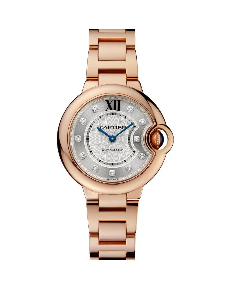 Ballon Bleu de Cartier watch, 33mm, Mechanical movement with automatic winding calibre Cartier 076, 18K pink gold case, 18K pink gold flueted crown set with a blue cabochon sapphire. Sapphire crystal, 12 zones ÒflinqueÓ dial set with 11 brilliant-cut diamonds totaling 0.05 carats, silvered with sun-like finish and lacquer, 1 Roman numeral, sword-shaped blued-steel hands. 18K pink gold bracelet.