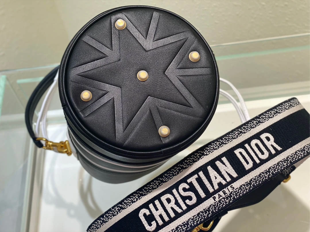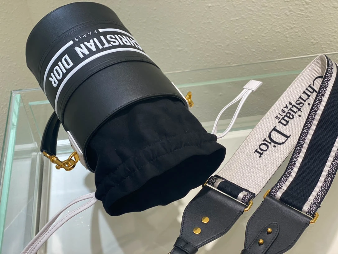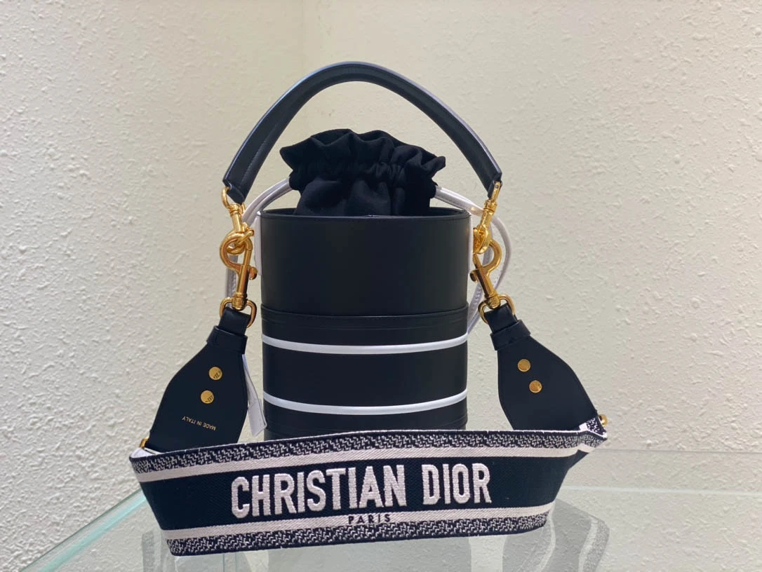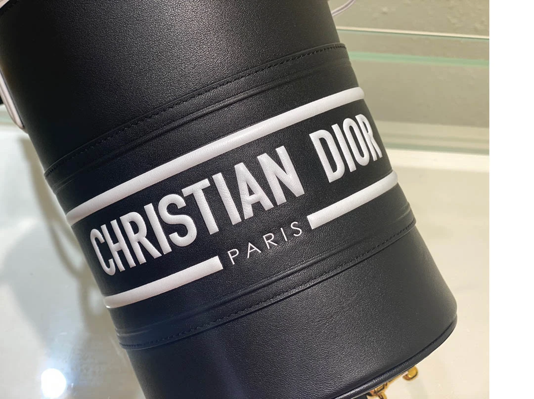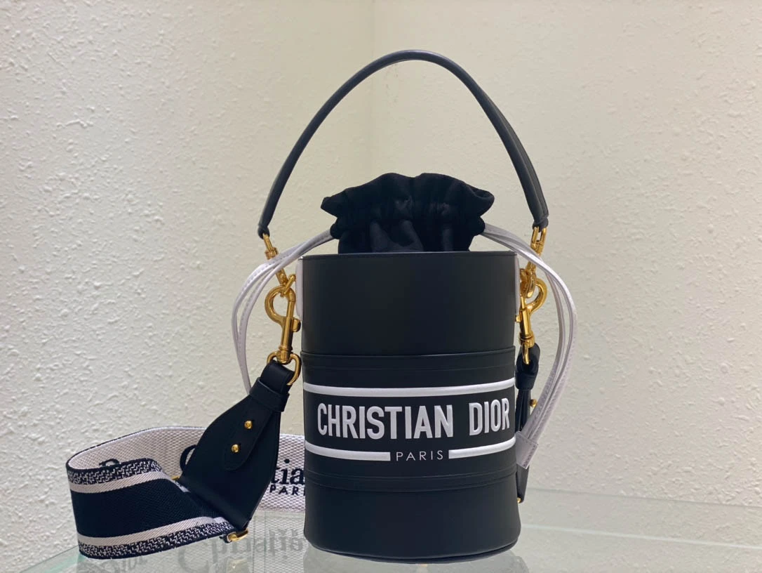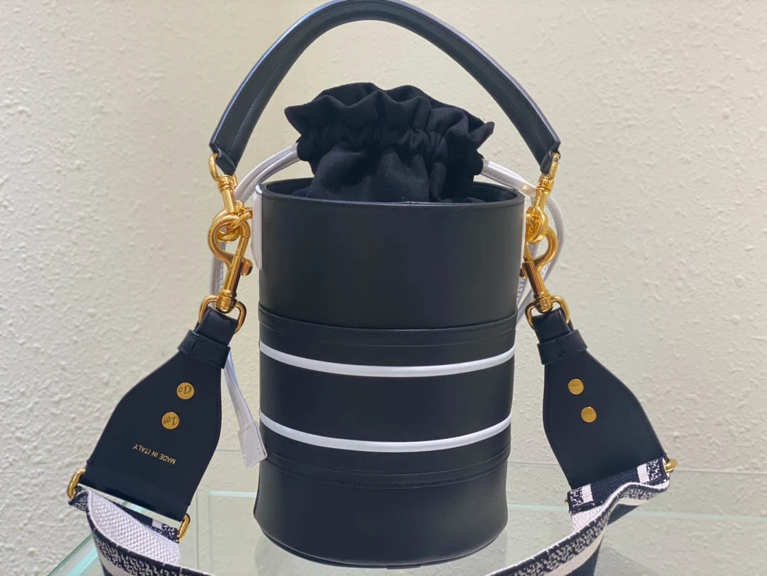 Black Cowhide Hollow Oblique Printed Bucket Bag Size 22cmx16cm