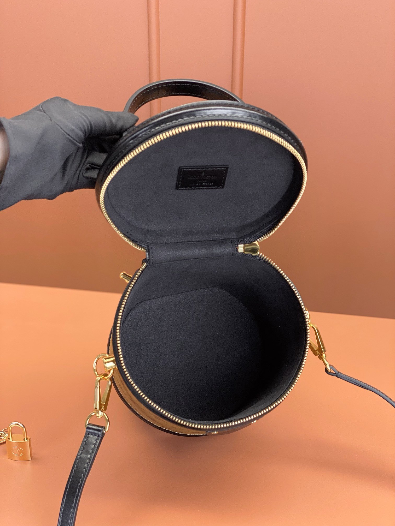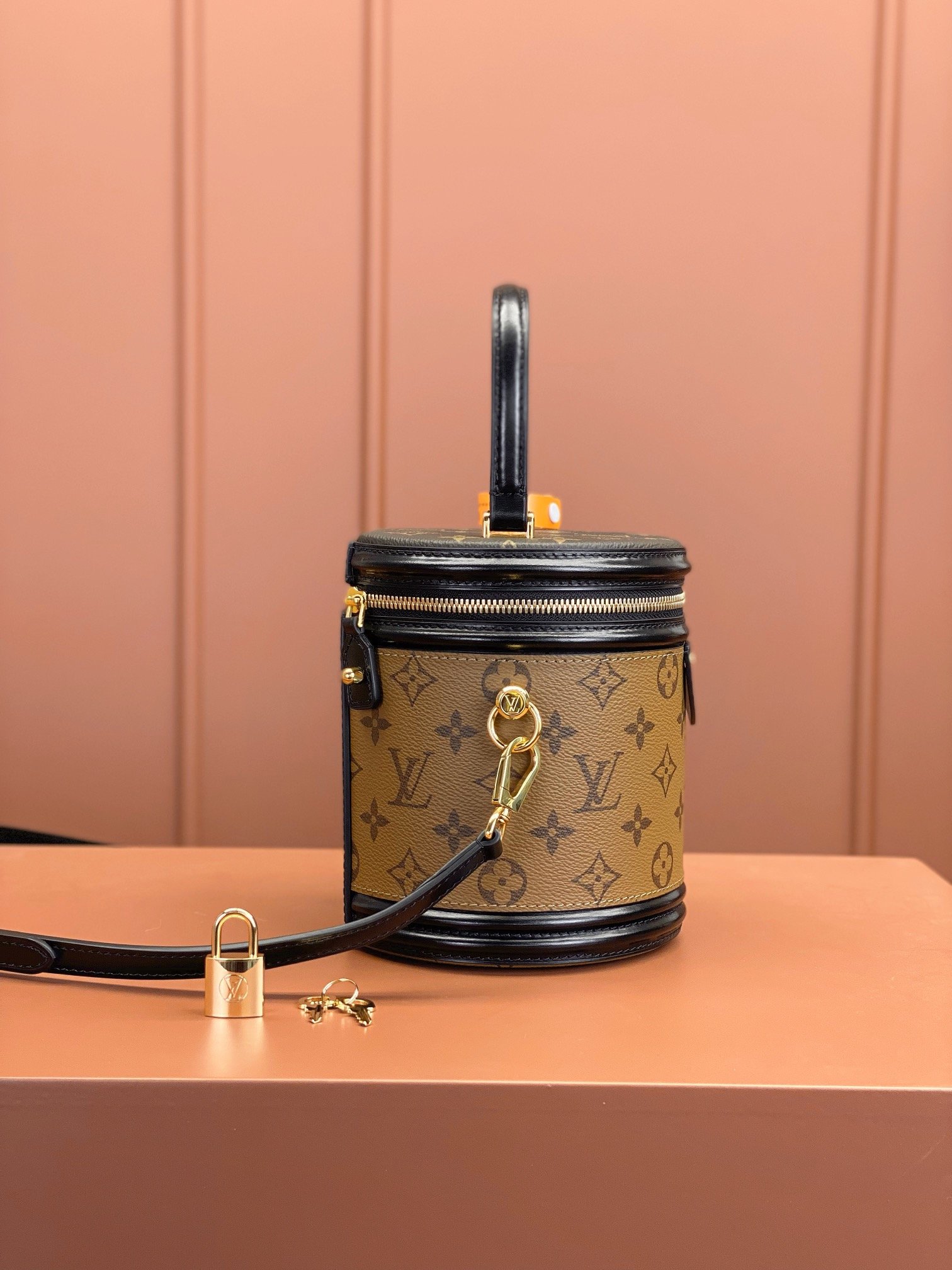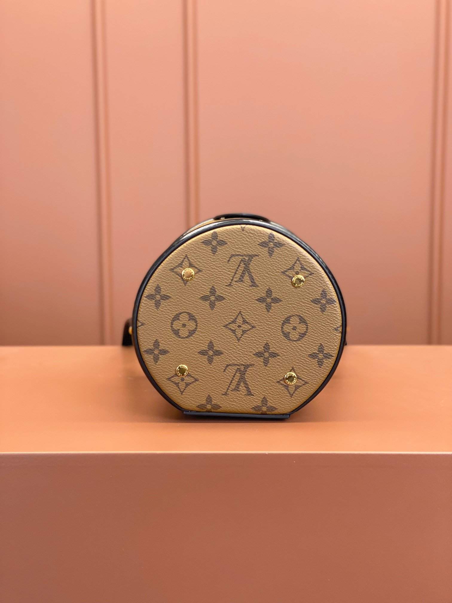 Featuring the historical shape of the LV Cannes beauty case, designer Nicolas Ghesquière revives a long-standing classic with the Cannes handbag. Petite in size and presented in a mix of Monogram and Monogram reverse coated canvas, the elegant piece reanimates a traditional silhouette steeped in Louis Vuitton heritage. A removable leather strap and top handle provide a range of carrying options.