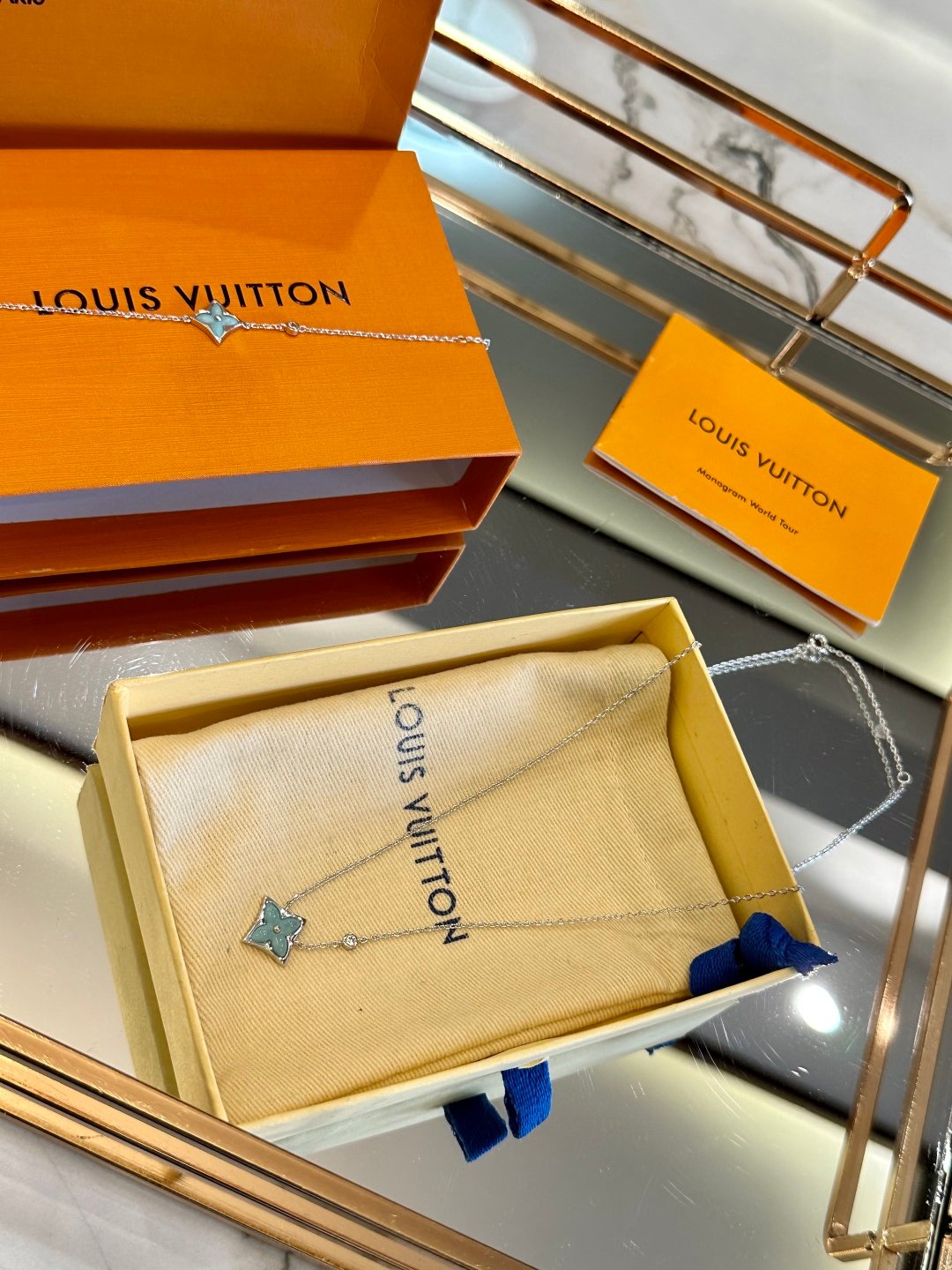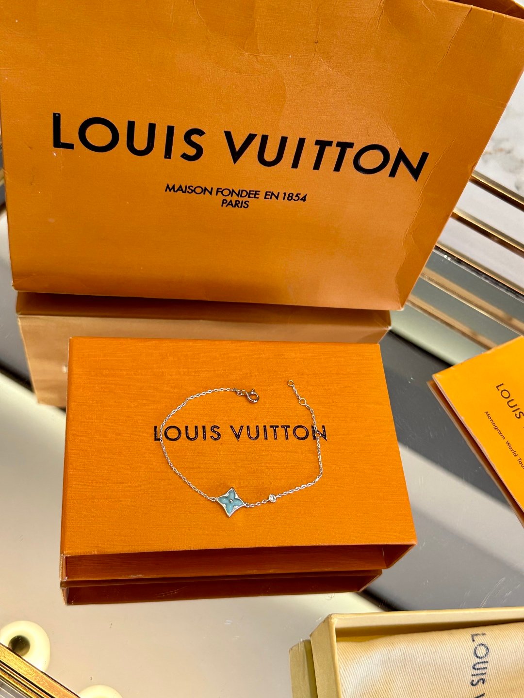 The Color Blossom pieces celebrate the emblematic Monogram Flower, designed in 1896 by Georges-Louis Vuitton, son of the founder. Set into 18-karat yellow gold, this precious bracelet features a Star motif carved from amazonite, hand-pol…