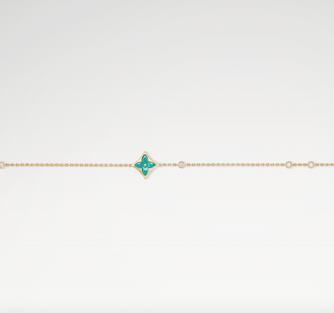 The Color Blossom pieces celebrate the emblematic Monogram Flower, designed in 1896 by Georges-Louis Vuitton, son of the founder. Set into 18-karat yellow gold, this precious bracelet features a Star motif carved from amazonite, hand-polished to a high gloss and accented by a brilliant round diamond on the chain. Months of work were necessary to perfect the stone’s subtle curves and sparkle. This delicate bracelet is an invitation to stack, mix or match with other models from the collection.