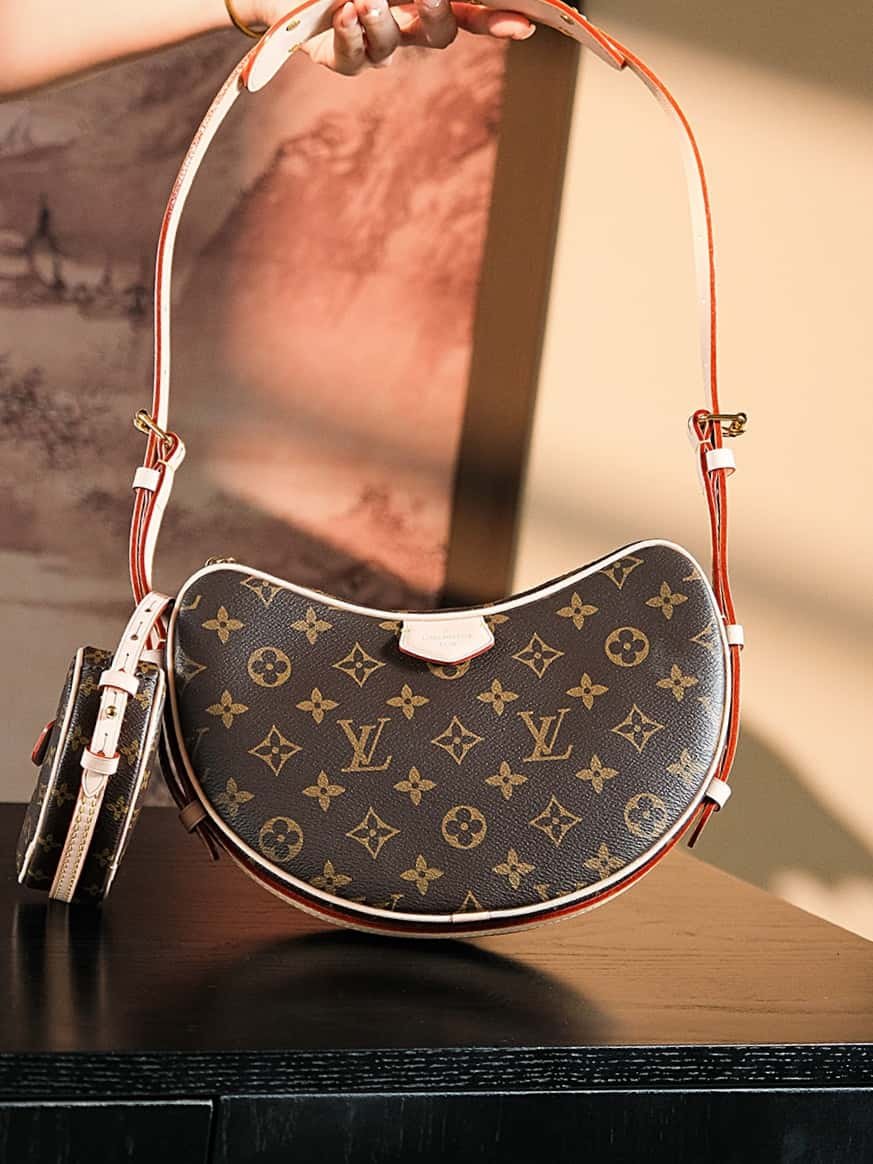 The Croissant MM handbag is made from Monogram coated canvas with natural cowhide-leather trim and comes with an adorable miniature version of the same bag. Thanks to its removable and adjustable strap, this versatile bag can be worn cross-body, short- or long-shoulder, and with or without the matching mini bag.