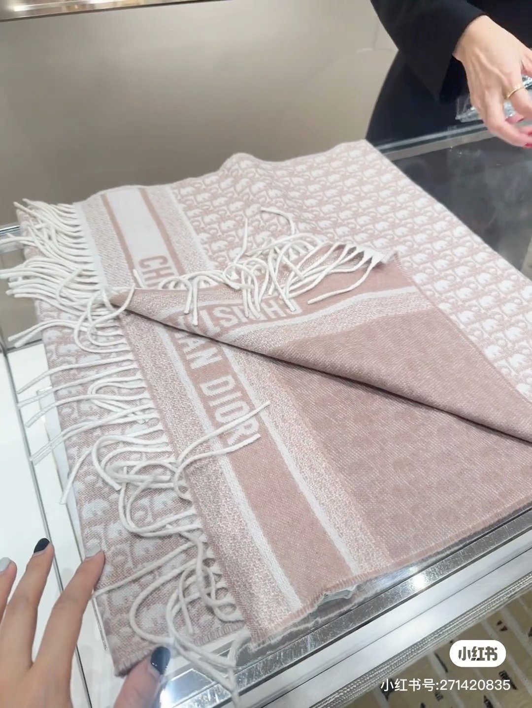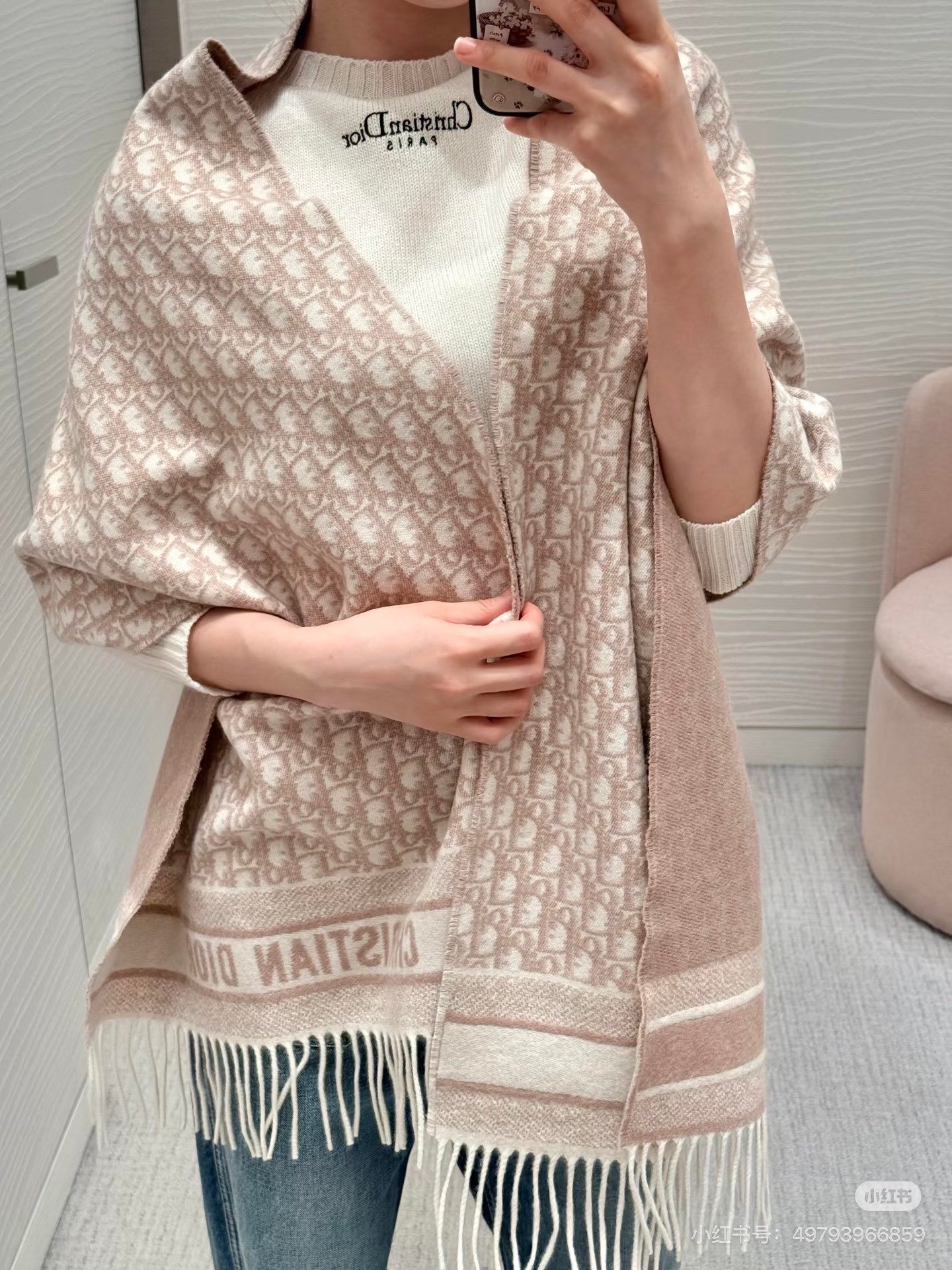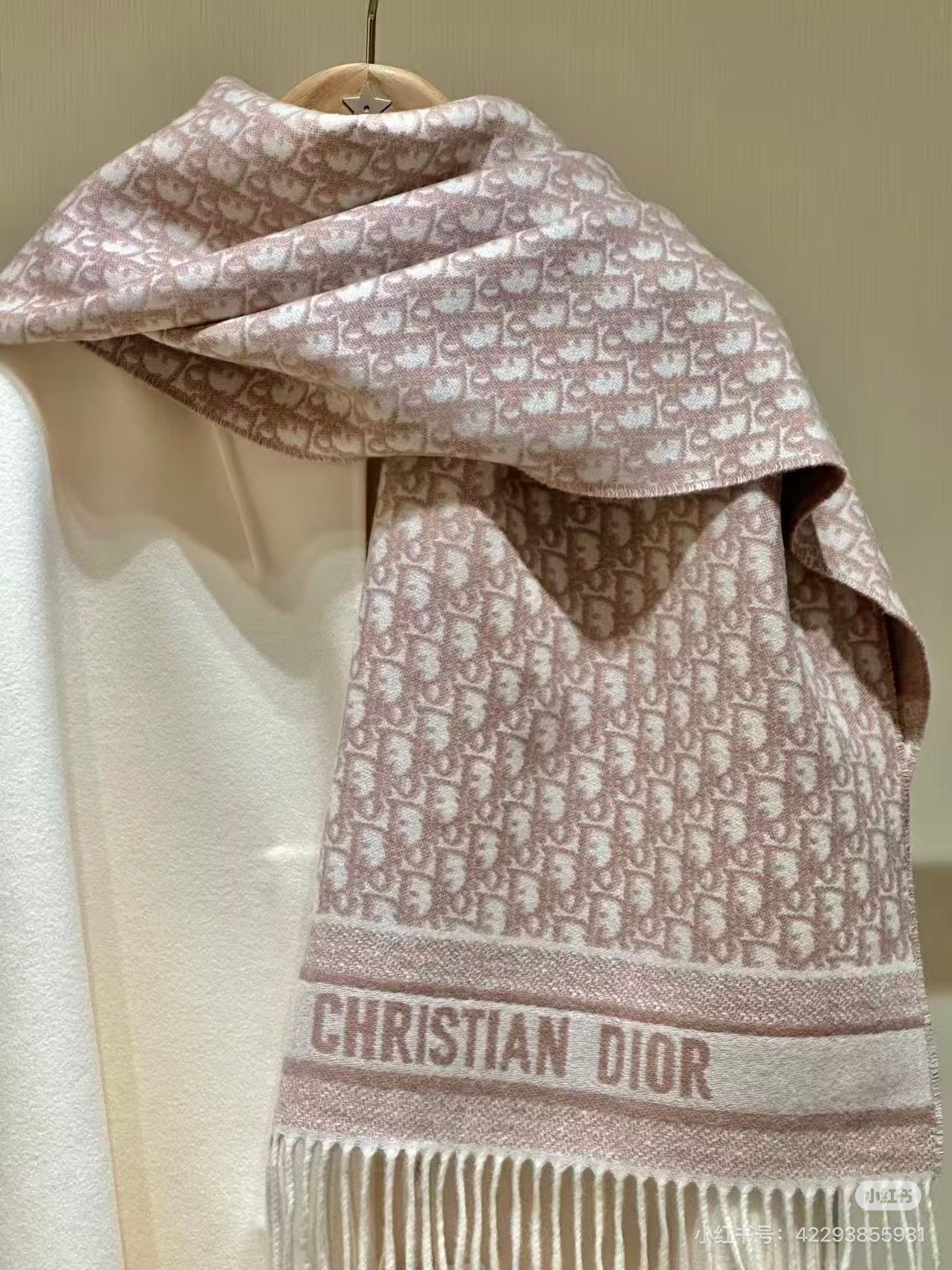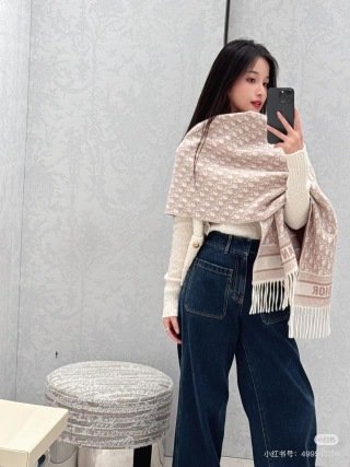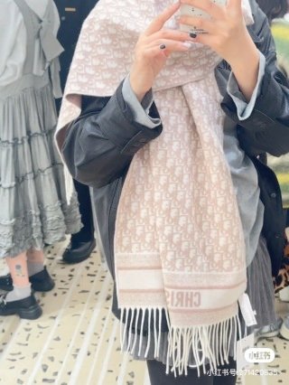 The Dior Oblique scarf honors a House motif that has been a hallmark since 1969. Crafted in a Rose des Vents pink cashmere blend, the double-sided style is embellished with Christian Dior signature jacquard bands and fringed edges. Delic…