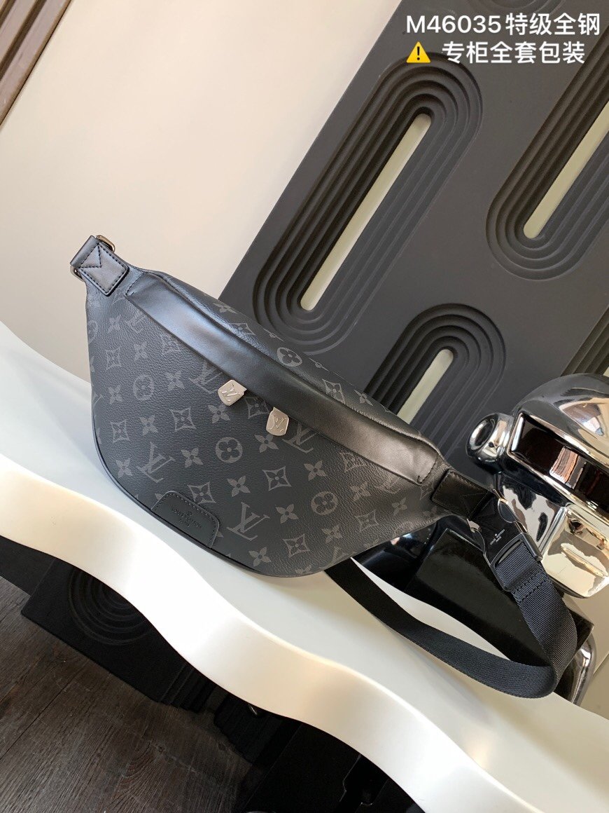 Crafted from Monogram Eclipse canvas, the Discovery bumbag offers the ideal mix of casual chic and modern functionality. With a body-friendly shape and adjustable belt, it can be worn around the waist, over the shoulder or slung stylishl…