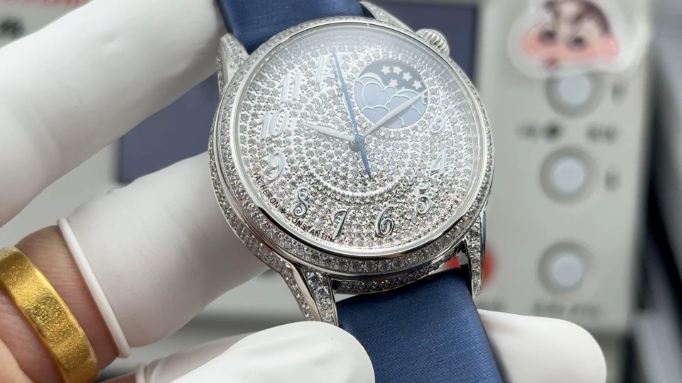 Diameter35 mm Thickness9.52 mm Water-resistance3 bar (30 m) Case backTransparent sapphire crystal caseback Dial description18K gold dial fully set with 574 round-cut diamonds ~1.50cts. 18K gold ring set with 34 round-cut diamonds ~0.1cts…
