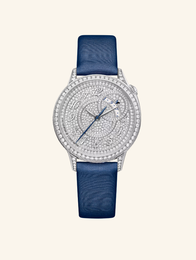 Dial description18K gold dial fully set with 574 round-cut diamonds ~1.50cts. 18K gold ring set with 34 round-cut diamonds ~0.1cts, surrounding an off-centered date. Leaf-shaped hour/minute hands in 18K gold and blued seconds hand. 18K gold Arabic numerals hour-markers.