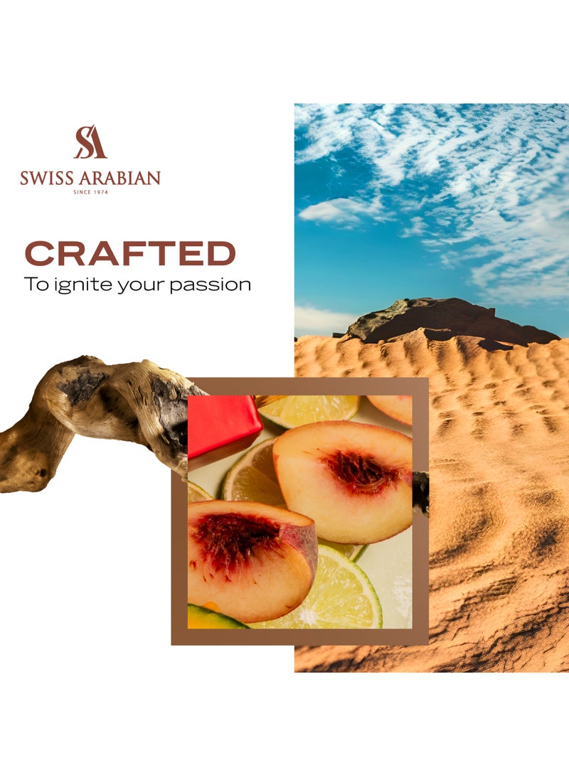 Swiss Arabian Shaghaf Oud Ahmar Eau de Parfum is a fruity, floral, amber fragrance that embodies luxury, sophistication, and opulence. From the very first spritz, this exquisite scent makes a sparkling entrance with a fresh and invigorating blend of bergamot iris, freesia and juicy peach and melon. These bright top notes set the stage for a fragrance that is both uplifting and playful, drawing you in with their delicate, carefree nature. At its heart, Shaghaf Oud Ahmar reveals a mouth-watering fusion of apple, rose and tonka, creating a rich, fruity core that exudes sweetness and abundance. This middle layer is vibrant and full of life, making it the perfect balance to the fragrance’s luxurious base. The scent gradually settles into a warm, sensual base of amber, vanilla, and exquisite woods, with soft powdery musk enhancing the depth and richness. The addition of cedarwood, sandalwood, and oud gives the fragrance a grounding, sophisticated finish that lingers in the air, leaving a unique and unforgettable trail. Ideal for those who appreciate an elegant, indulgent scent, Shaghaf Oud Ahmar is a signature fragrance that speaks of luxury and refinement, perfect for any special occasion.